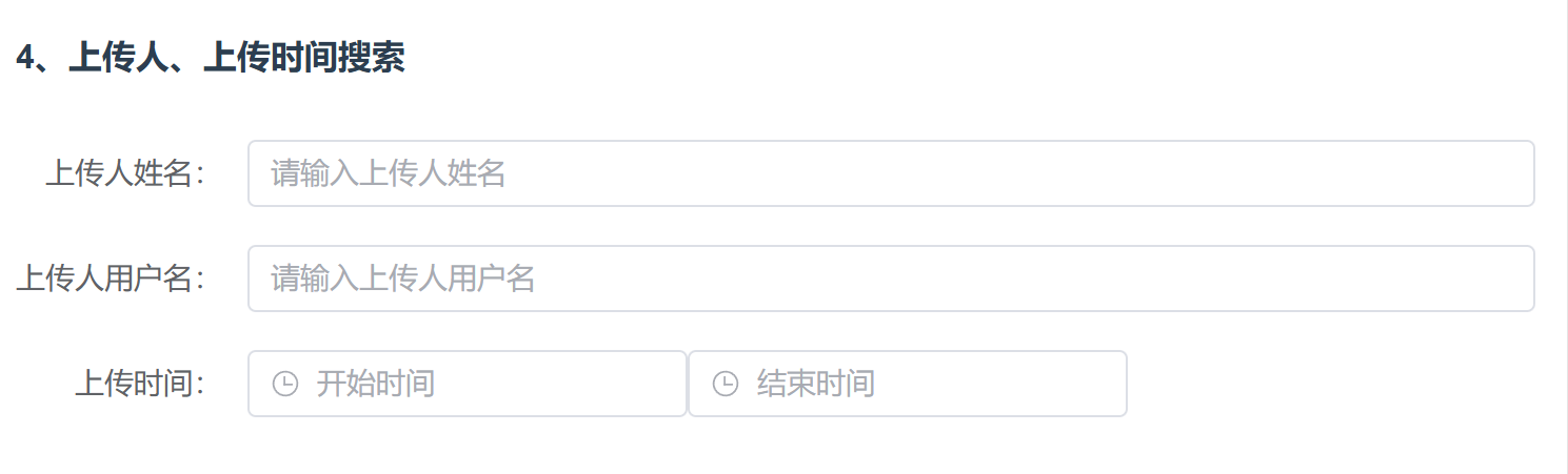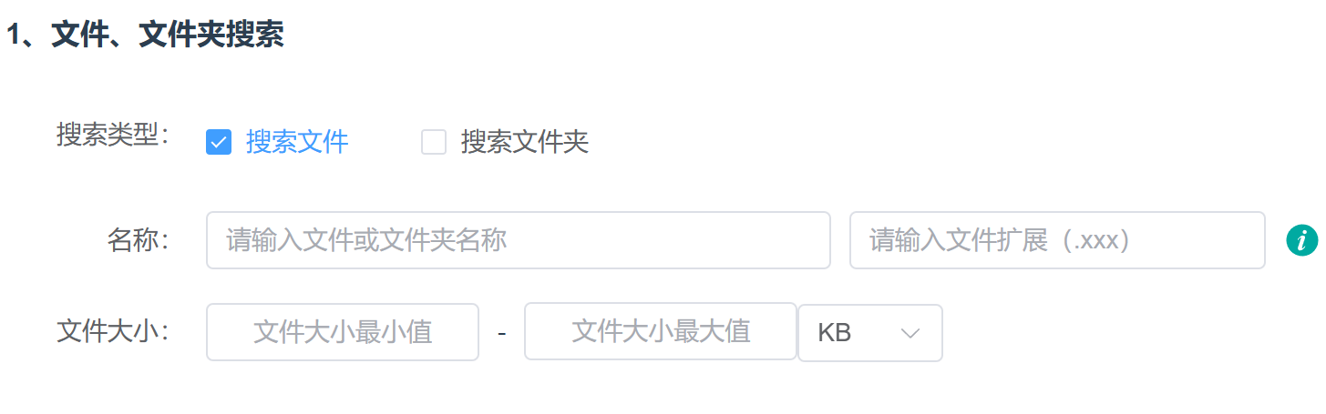 搜索界面包括:文件、文件夹搜索;关键词、组搜索;图片搜索;上传人、上传时间搜索;自定义属性搜索。